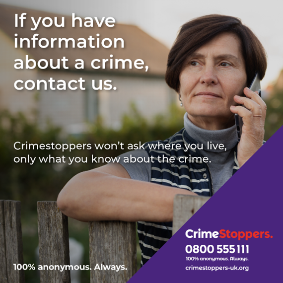 Our charity provides a way to give information about crime anonymously 24/7, 365 days a year. You can tell us what you know about a crime over the phone on 0800 555 111 or by filling in our online form. We will then pass this information on to the relevant authority or police force.When sharing information with our team, useful details include: descriptions, timings, locations, car make, model and reg.